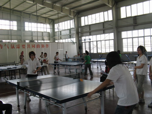 首先进行的是人文女队与商学院女队的比赛。人文代表队凭借队员实力上的优势先拔头筹。商学院女队随后便展开了反击。双方势均力敌,比赛进入拉锯战。精彩的扣杀、反拉屡屡出现。拉拉队也在场边不断地加油助威。但最终人文女队却在先赢一局的情况下被对手连扳三局,以1:3丢掉首场比赛的胜利。男队的比赛稍后开始。男队员们一路高歌猛进,顺利拿下比赛。