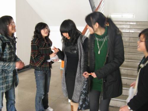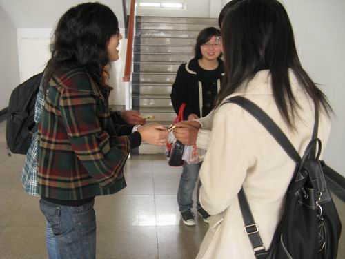 团委学生会成员又在一号楼门口向学生"佳人"们赠送巧克力。巧克力虽小,但情意不淡。小小的巧克力载着九色視頻