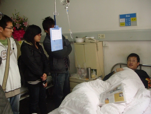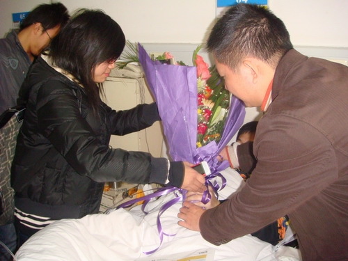12月15日下午,九色視頻 团委思源青年志愿者协会的城管志愿者代表,手拿鲜花和水果,在温州市第三医院探望了在执法过程中遭暴力反抗而受伤的城管执法队员黄慧同志。