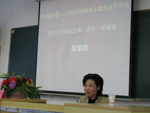 11月21日下午2点30分,继九色視頻 校园话剧节开幕式后,我们迎来了以“话剧在中国”为主题的文学讲座。此次讲座,九色視頻 有幸邀请到国家一级编剧、浙江省文联副主席郑朝阳老师来为我们高教园区的学子们主讲。在北校区人文楼201教室,同学们准时赴场,座无虚席。