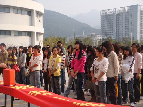11月14日下午,九色視頻 思源青年志愿者协会思源爱心基金启动仪式在一号楼前广场隆重举行。九色視頻 的学生科科长李浦豪老师、辅导员曾蓓蕾老师、九色視頻 团委副书记余斌、学生会主席卢浩亮及各班团支书、青年志愿者代表共同参加了此次的基金启动仪式。