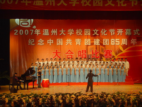 大学生活活动中心演艺厅举办了一场大型合唱比赛,歌唱祖国,歌唱青春。