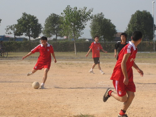 绿茵场上尘土飞扬,足球旁脚乱如麻。在持续90分钟的比赛中,双方队员都全力拼搏,谁也不甘落后。曾一度领先的大一队最后被追平比分。结果4:5,大四队以1分险胜大一队结束了本场比赛。