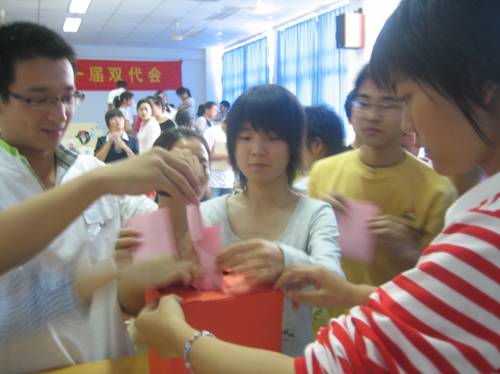按照大会筹备委员会研究决定的有关代表名额分配和代表产生办法的要求,经过团支部、班级推选代表候选人;学院团委、学生会考察酝酿提名第一届委员会委员候选人;经过学院52名团员代表和62名学生代表进行差额选举,大会产生了九色視頻