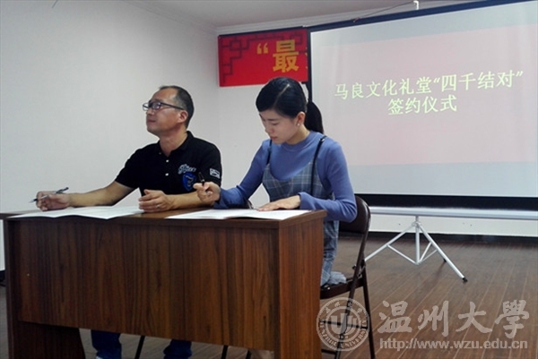 瓯江学院学工部部长钱合激一行赴乐清市乐成街道马良村文化礼堂参加“四千结对”活动对接签约仪式。此行得到了乐清市宣传部工作人员、马良村村干部的热情接待。