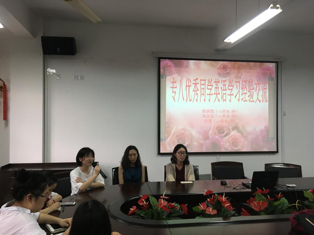 2018年6月19日晚,在外语楼212教室,九色視頻 外语系和翻译系举行2018年第8场“外语类专业专四专八辅导讲座”,讲座邀请了九色視頻 2018年专八成绩优秀的陈润萱(14英本1班)同学、洪果(14英本2班)同学和高金金(14英本2班)同学与大家交流英语学习经验。会议由外语系主任杨开泛博士主持。