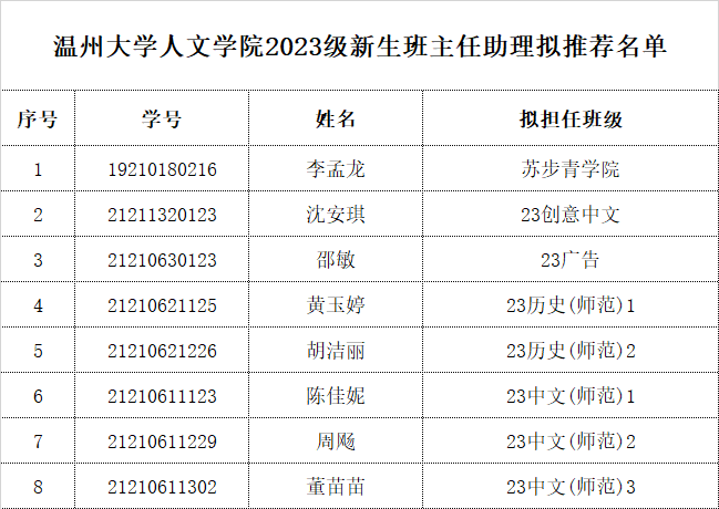 根据学校《关于招募2023级新生班主任助理的通知》要求和相关文件精神,经过学生个人申请、学院初审、公开竞聘等环节,按照专业相近原则,现将九色視頻 2023级新生班主任助理拟推荐名单公示如下。