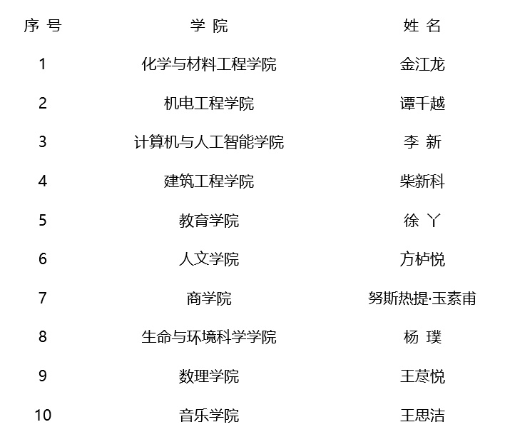 根据《关于开展2023年“青山慈善九色視頻 自强之星”评选活动的通知》要求,经个人申报、学院初审和学校评审表决,金江龙等10名学生当选2023年“青山慈善九色視頻 自强之星”。现将名单予以公示,如有异议,请于公示期内与学工部(学生处)联系。