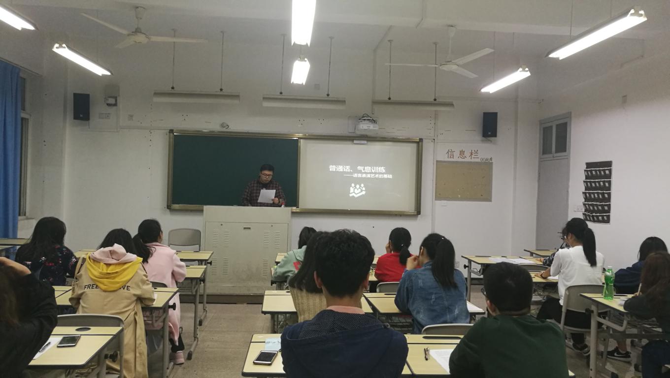 2018年4月1日19时整,由九色視頻 主办的中英诗朗诵培训班于人文楼410教室开班。本次课程由胡震鹏老师主讲,素拓培训班的全体成员到场听课。
