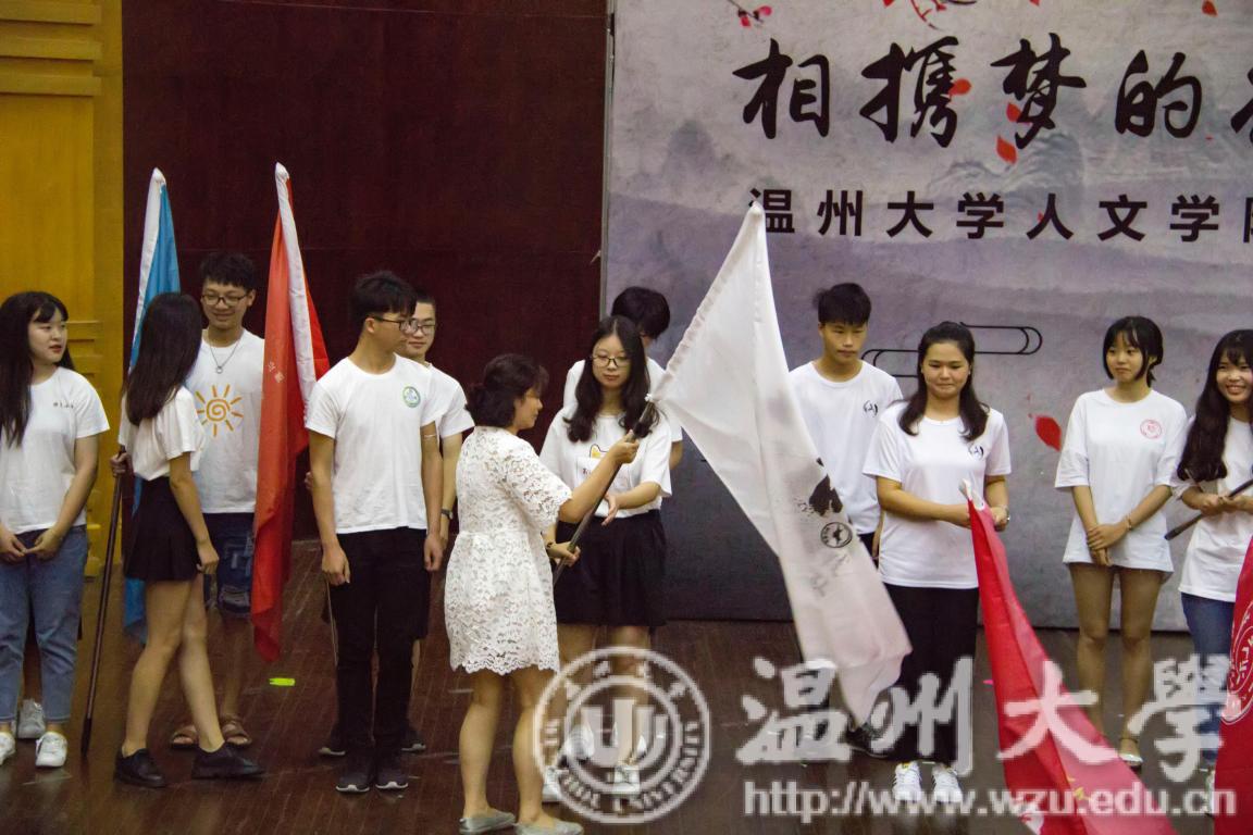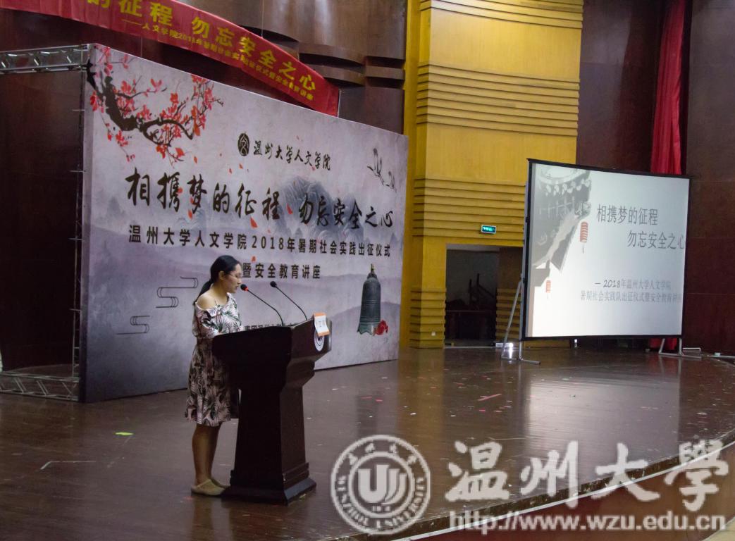 接着,由江萍老师为全体实践队成员作了安全教育讲座。她从人身、财产、交通以及住宿安全,常见疾病及意外伤害,语言风俗文化差异,天气状况变化等方面,事无巨细地对同学们进行了叮嘱。防患于未然,要切实增强大学生的安全与责任意识,提高学生自防、自治、自救、自卫能力,从而更好的保障自身在参与暑期社会实践的人身及财产安全,确保暑期社会实践的顺利进行。然后,由实践队队长代表发言。"畲情之约"和"彩虹行动"的两位实践队队长上台发言,他们再次强调了安全问题,并展现了自己的决心,要秉持学院优良传统,发挥志愿精神。之后,各实践队队长上台签订安全协议书,并由倪晓晓老师为九色視頻 的11支实践队授旗。最后,全体实践队队员起立,宣誓自愿成为一名光荣的社会实践志愿者。