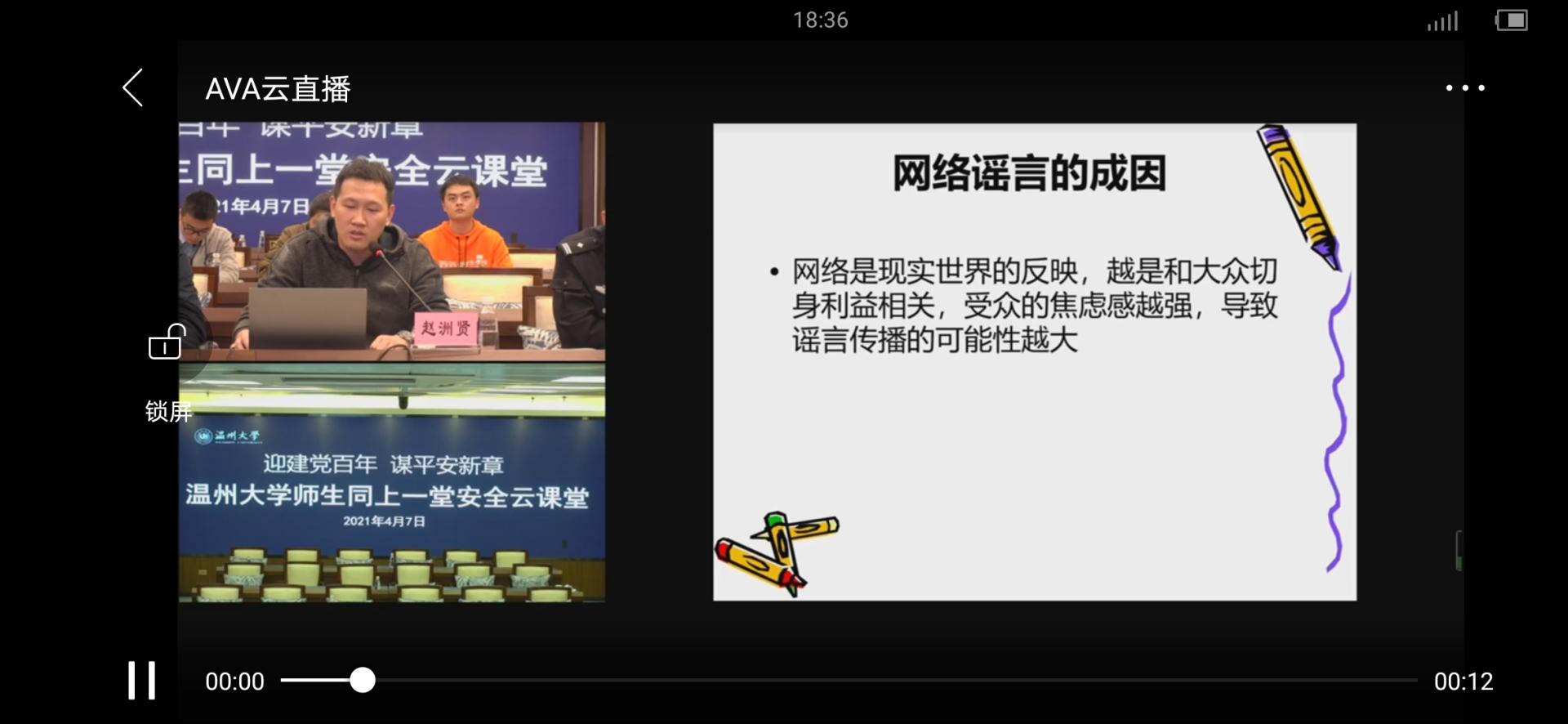师生共上安全云课堂,老师的叙述娓娓道来,以周边发生的事例不断强调网络安全的重要性,使我们意识到网络诈骗的危害、网络谣言的可怖以及网络安全警钟长鸣。作为当代大学生,我们要时刻警惕网络诈骗,能够辨别网络陷阱,维护自身信息安全。提高网络修养人人有责,不信谣,不传谣,还网络一片清朗空间,牢记网络不是法外之地。
