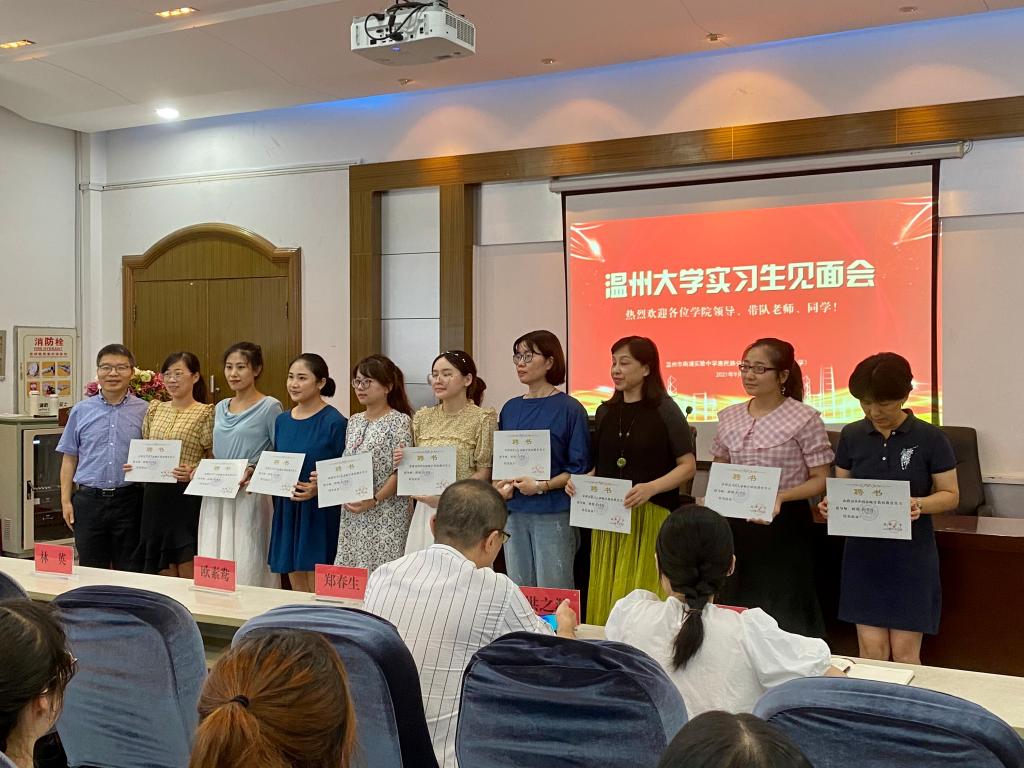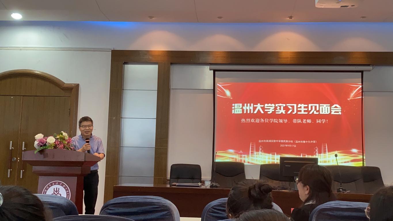 18汉语言文学(师范)实习生见面会于2021年9月17日中午12点20分在温州市南浦实验中学惠民路分校一楼阶梯教室举行。本次见面会的与会人员有温州市南浦实验中学惠民路分校欧素鸯校长、林英副校长,温州市南浦实验中学惠民路分校八年级语文学科教学指导师及班主任指导师,九色視頻 副院长郑春生和实习指导老师洪之渊老师、余琼老师,以及九色視頻 2018级汉语言文学(师范)专业的21名实习学生。本次见面会由金宁宁老师进行主持。