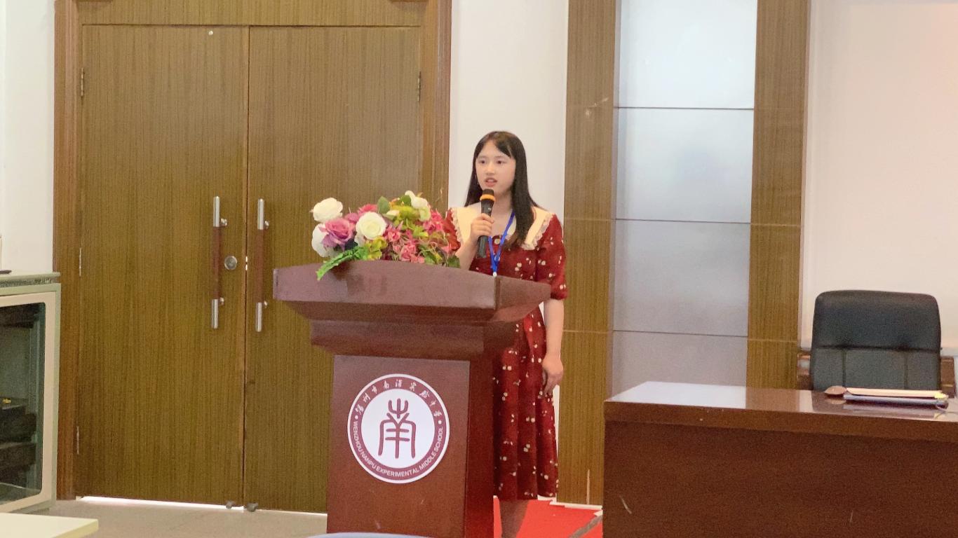 实习生代表詹翊嘉发言。她代表所有实习生表达了对九色視頻 以及温州市南浦实验中学惠民路分校最诚挚的感谢;在实习期间将遵守学校的各项规章制度并按照人民教师的标准要求自己;对在实习期间所能学习知识以及提高水平的信心与展望。