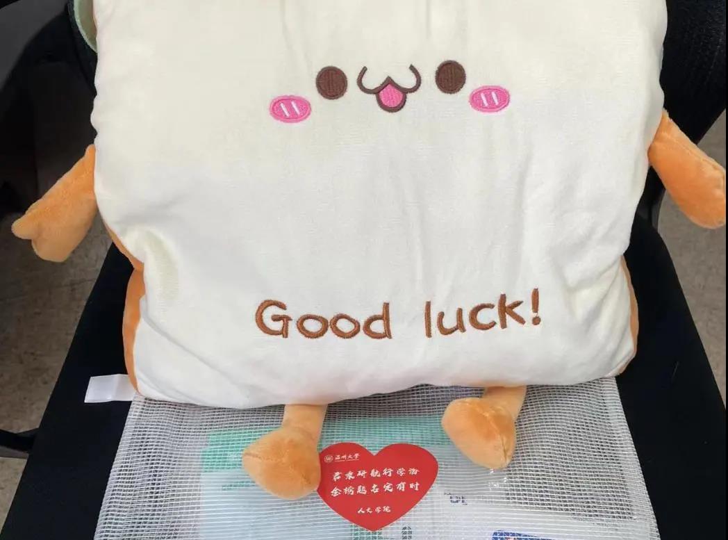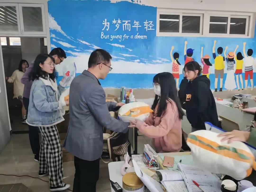 在老师与同学们进行了亲切的交谈之后,活动进入了第二个环节——发放慰问品。同学们有序地从魏一老师和刘纪峰老师的手中领取抱枕和考试用具。同时,魏一老师和刘纪峰老师还不忘提醒同学们:"冷空气来袭,要注意保暖;备考的过程很艰苦,要学会调整自己的状态。"细微之处的关怀,都只为让奋战的同学们全心备考。同学们纷纷对学院领导和老师们的支持表示感谢,他们异口同声道:“我们会与同伴们互相督促,共同奋斗!”