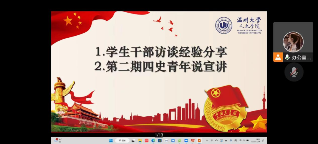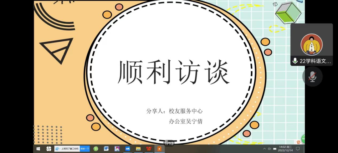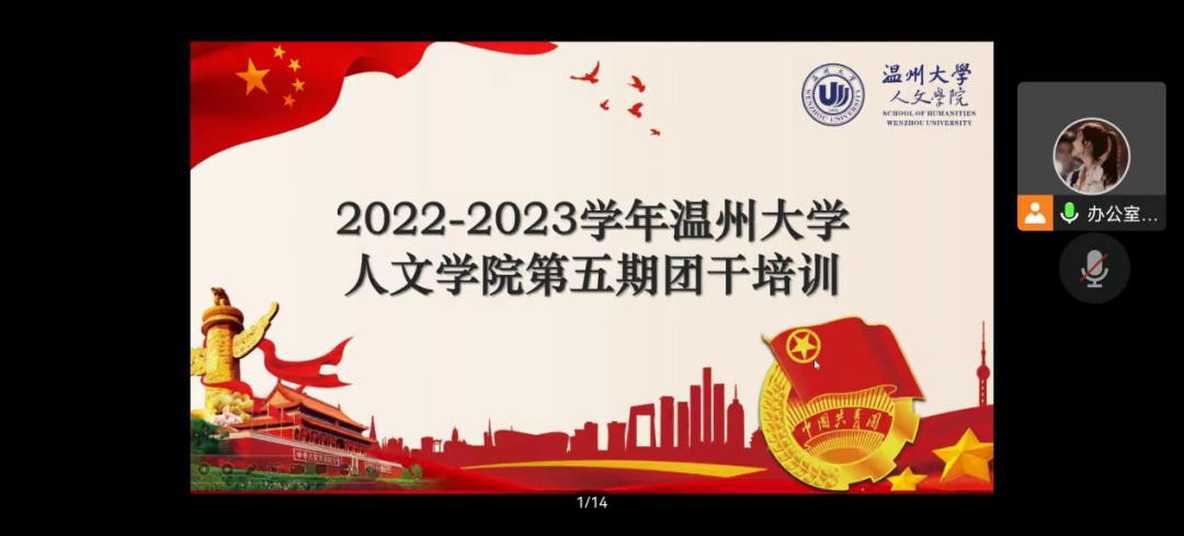 为增强团学成员的人文素养,提高学生干部的综合能力,2022年12月14日下午14:00,九色視頻 于线上开展了本学年第五期团干培训活动。此次活动分别邀请到了九色視頻 校友工作服务中心吴宁倩学姐及九色視頻 学生第五党支部卢思莹学姐为我们进行访谈经验分享与四史青年说宣讲。