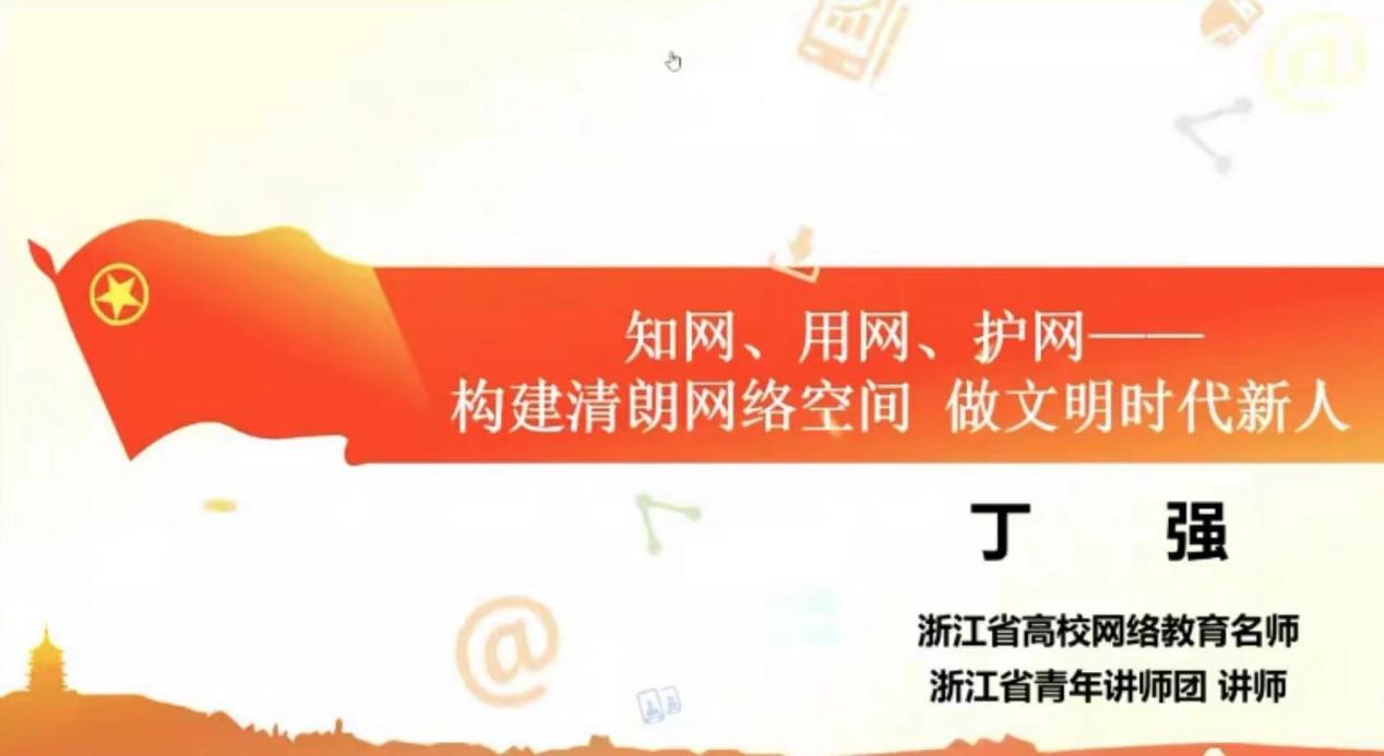 浙江省高校网络教育名师,浙江省青年讲师团丁强讲师受邀担任“清朗网络空间”专题主讲人。丁强老师用柱形图的方式直观展现出全球数据圈规模每年呈现向上趋势。在这样的客观趋势下,老师表现出对当下网络空间并不清朗的担忧。最后,丁强老师提出要遵循互联网信息服务管理“七条底线”和“九不准”,倡导广大学子遵守法律法规,绝不损害国家利益,共同构建清朗网络空间,做文明时代新人。
