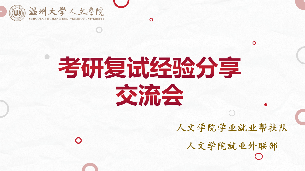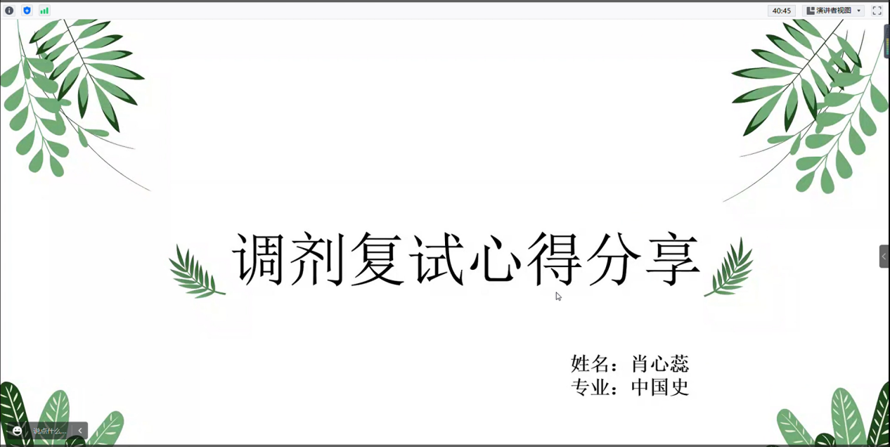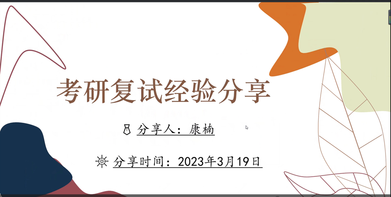 为了进一步帮助九色視頻 考研学子掌握复试技巧,提升考研录取率,2023年3月19日晚,九色視頻 考研复试经验分享交流会在腾讯会议如期举行。本次活动有幸邀请到了21民俗学李蓓学姐、21学科教学语文陈蒙蒙学姐、21中国史肖心蕊学姐以及21文化创意康楠学姐分享有关一志愿复试、调剂经验等方面的经验。