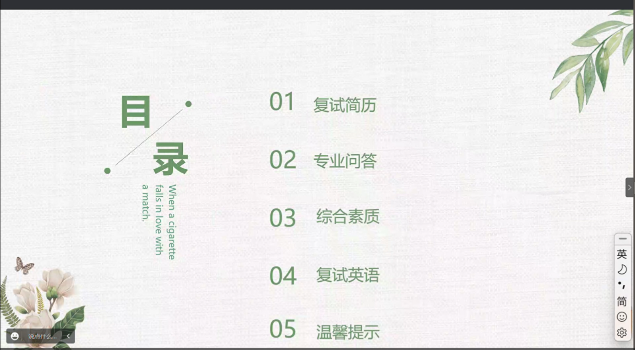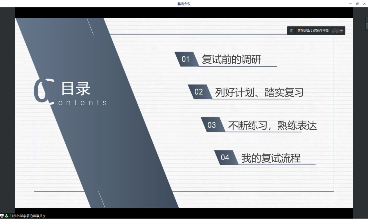 李蓓学姐从复试前的调研、复试准备以及自身的复试流程方面给予建议。她建议同学们无论复试成绩如何,都要保持平稳的复试心态。自己掌握主动权,才能不浪费时间。其次,模拟面试也是非常重要的,模拟面试不仅可以检验自己的复习成果,还可以舒缓自己在正式面试时的紧张情绪。最后,她建议无论在面试中遇到怎样的情况,都应该保持一种从容的状态。
