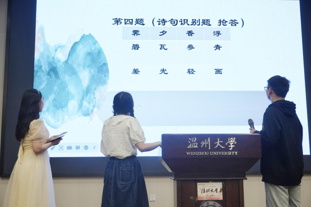 “突出重围”环节中,晋级的四位选手被分为两组两两对决,韩祺对何泽炜,俞璐佳对郑军,两组分别进行了抢答比赛。比赛现场紧张激烈,选手们目视屏幕,手握抢答器,不敢有丝毫分心。“吟客相过日,飞花欲尽天”,选手们通过诗歌对答,以诗会晤,如切如磋,如琢如磨,应答如流。经过两轮的激烈角逐,最终角逐出了前三甲,分别是状元俞璐佳、榜眼郑军、探花韩祺。