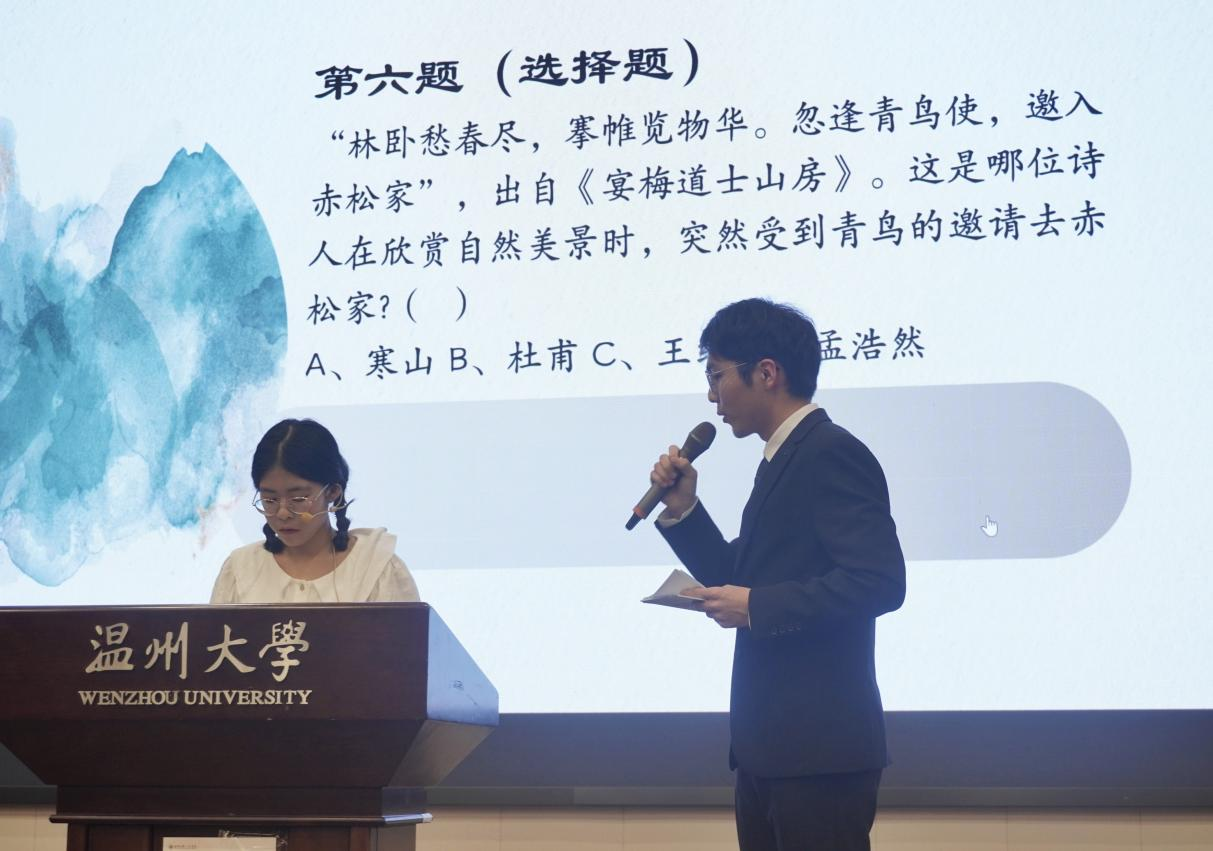 “群雄逐鹿”中,参赛选手根据初赛得分情况分别组成五人团、十人团。五人团选手只能选择一套题,十人团选手作答所有题,两团各晋级两人进入第二轮角逐。在答题过程中,选手们或展露“我是清都山水郎,天教分付与疏狂”的自信旷达之姿,或尽显“吾胸有成竹,明月皆入怀”的运筹帷幄之风,体现出深厚的文学素养。在点评环节中,王朋飞老师分别对诗词格律及词牌名作了专业阐释,令同学们受益匪浅。