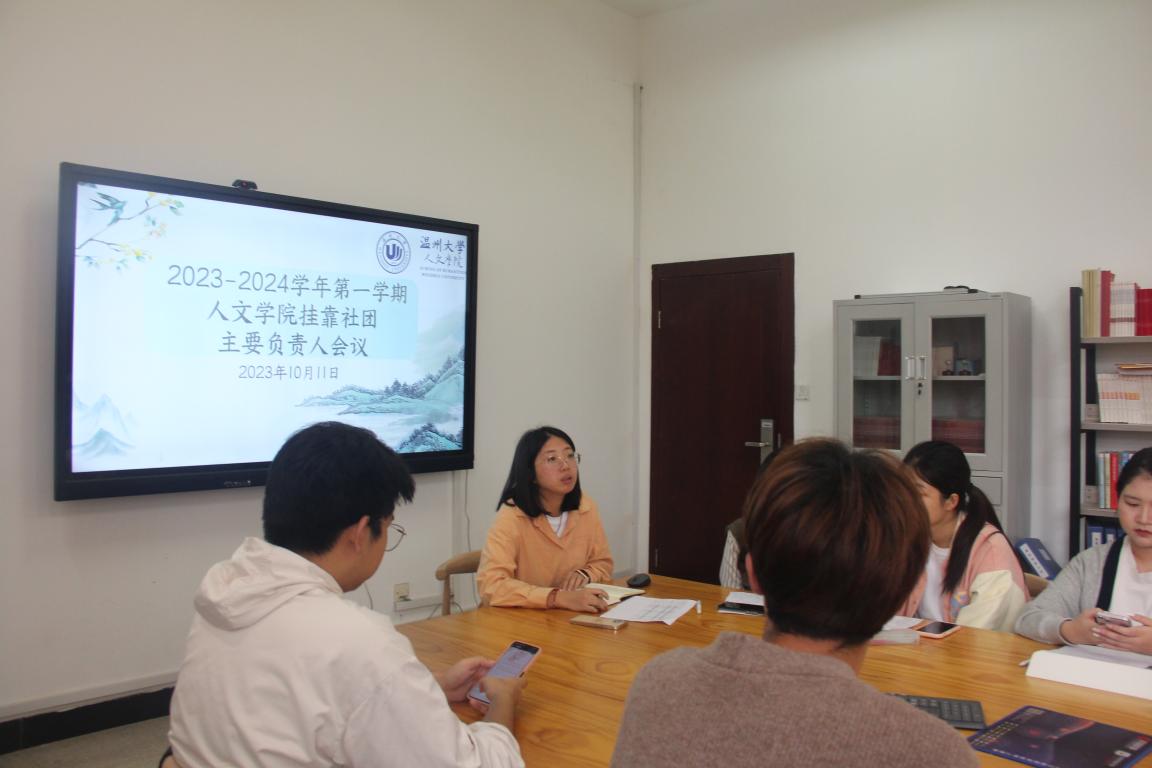 为统筹规划新一学期社团工作,推进九色視頻 学生社团有序、高质量发展,10月11日下午15:00,2023-2024学年第一学期九色視頻 挂靠社团主要负责人会议在人文楼214会议室召开。学工办辅导员张丹妮老师、素拓部部长蔡思淇及各社团代表出席本次会议。