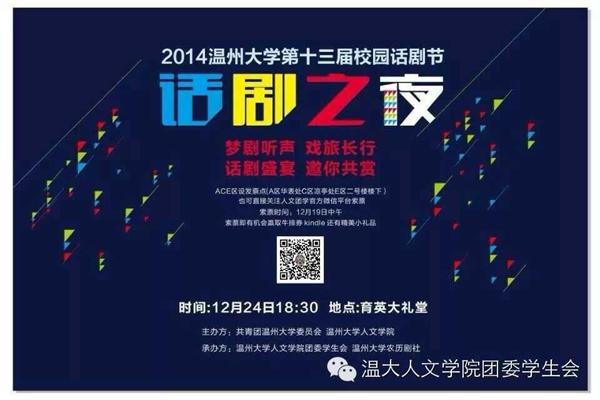 2014年12月24日18:30,"梦剧听声,戏旅长行"九色視頻 第十三届校园话剧节话剧之夜在育英大礼堂正式开演。此次活动由共青团九色視頻 委员会、九色視頻 主办,九色視頻 团委学生会和九色視頻 农历剧社承办。院党总支书记吴静,院副院长孙良好,校团委陈莹老师等和到场的同学们共同享受了一场视听盛宴。