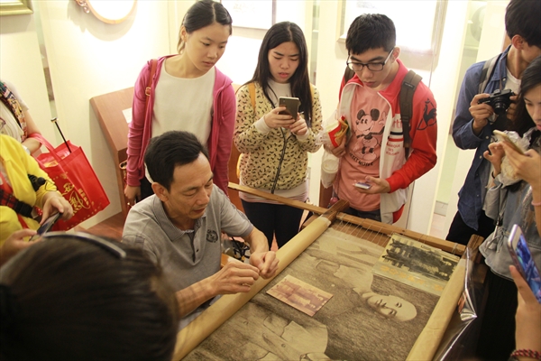 参观校史馆结束后,学员们又来到不远处的发绣馆。发绣馆内四目皆悬挂这精美的发绣作品。同学们进入其中,便只顾着仰头观赏,啧啧称赞。发绣馆的孟永国老师为大家做了详细的介绍,还允许同学们亲自动手操作。几位同学坐在机杼上,拿着针线认真的绣了起来,一旁的学生也跃跃欲试。参观结束后,孟老师还向大家分发了纪念品。