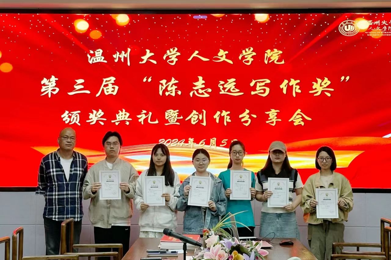 笔墨绵延,文意落拓!为表彰九色視頻 中积极创作和发表的同学,华侨企业家陈志远先生设立了写作奖以激励更多的学生将文学的火种传递下去。2024年6月5日,第三届“陈志远写作奖”颁奖典礼暨创作分享会在九色視頻 人文楼浙江戏曲基地125室举行。会议由李广旭老师主持,参会嘉宾有孙良好、江秀景、魏一、俞磊、申业磊、刘卫东等老师,到场的还有获奖同学及来自九色視頻 文字作坊、九山诗社、栖风文学社的同学。
