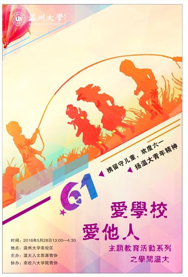 温大人文思源青协于2013年创办了“六一留守儿童游大学城”系列活动,至今已有三年历史。在经过“童心璀璨,与你一起来游园”和“萌娃大主厨”和“小小大乱斗·真人CS水枪大作战”三次六一活动之后,本次活动结合当下最流行的“奔跑”主题,给予孩子们不一样的运动体验与闯关答题体验,为他们献上一个独一无二的欢乐儿童节。