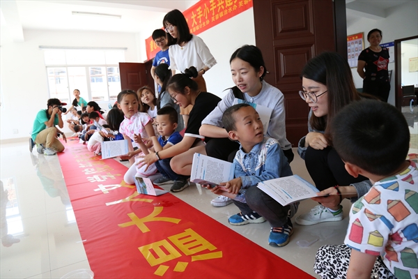 接着,志愿者们进行了环保标语书写的活动。志愿者们带领小朋友们仔细阅读了有关五水共治的宣传册,册子不厚,但是志愿者们却是认认真真地给小朋友们讲解,和小朋友们灌输环保的理念,帮助他们认识到要保护水源,保护环境。这样的理念从小养成,对他们今后为保护身边环境也是打下了基础。在学习了简单的知识后,志愿者开始和小朋友们商量环保口号,刚开始小朋友们都没有什么思路显得有些着急和不耐烦,在志愿者们的耐心指导下小朋友们有了思路,纷纷动笔开始在横幅上写口号。一个个稚嫩的字却包含着小朋友们和志愿者们共同的智慧结晶,这是他们经过思考讨论后得出的口号。小小的房间里,小朋友们和志愿者们都蹲着在横幅上写着,绘着,整个房间里洋溢着欢乐的气氛,一张张灿烂天真的笑脸格外明丽。