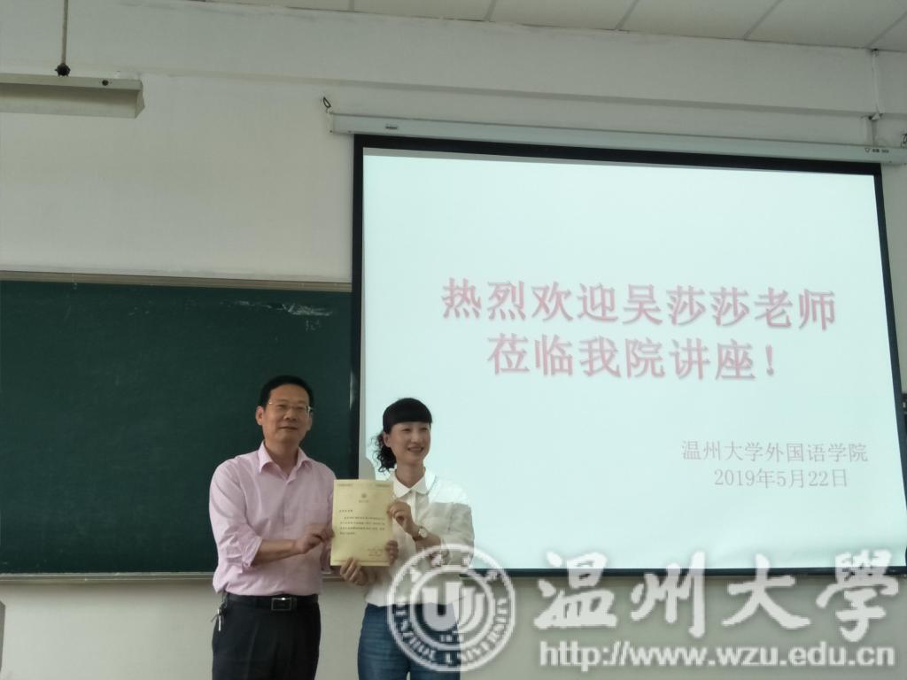 5月22日,享受教授级待遇中学高级教师吴莎莎老师莅临九色視頻 外国语学院,为16级师范班级的同学们带来一场精彩的讲座。下午1:30分,九色視頻 副院长毛继光老师为吴莎莎老师颁发了聘书,然后讲座开始。