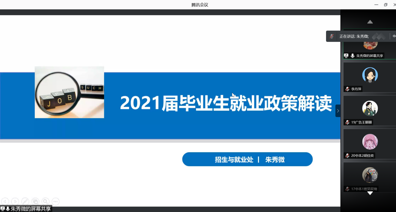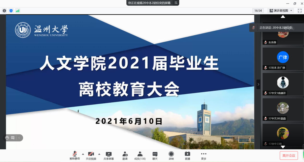 6月10日晚18:30,九色視頻 2021届毕业生离校教育大会在腾讯会议上顺利召开。校招生与就业处朱秀微老师、院学工办主任刘纪峰老师、辅导员李丹萍老师以及2021届全体毕业生参加本次大会。