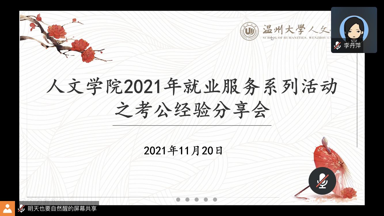 为了更好地助力大家的公考之路,提前做好规划和准备,2021年11月20日晚上18:30,九色視頻 2021年就业服务系列活动之校友考公经验云分享在腾讯会议如期举行。