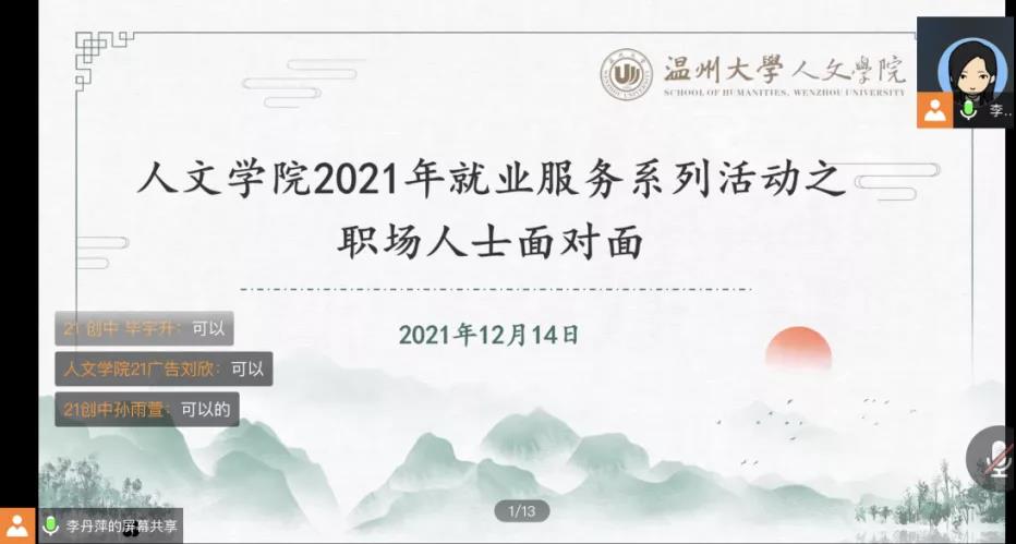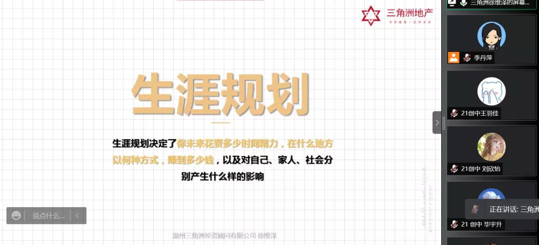 为明确同学们的职业规划方向和职业发展成长路径,2021年12月14日下午,九色視頻 邀请温州三角洲投资顾问有限公司人力资源经理徐维泽和策划经理张舒乐,在腾讯会议上为大家分享职业规划和职场上的那些事儿。