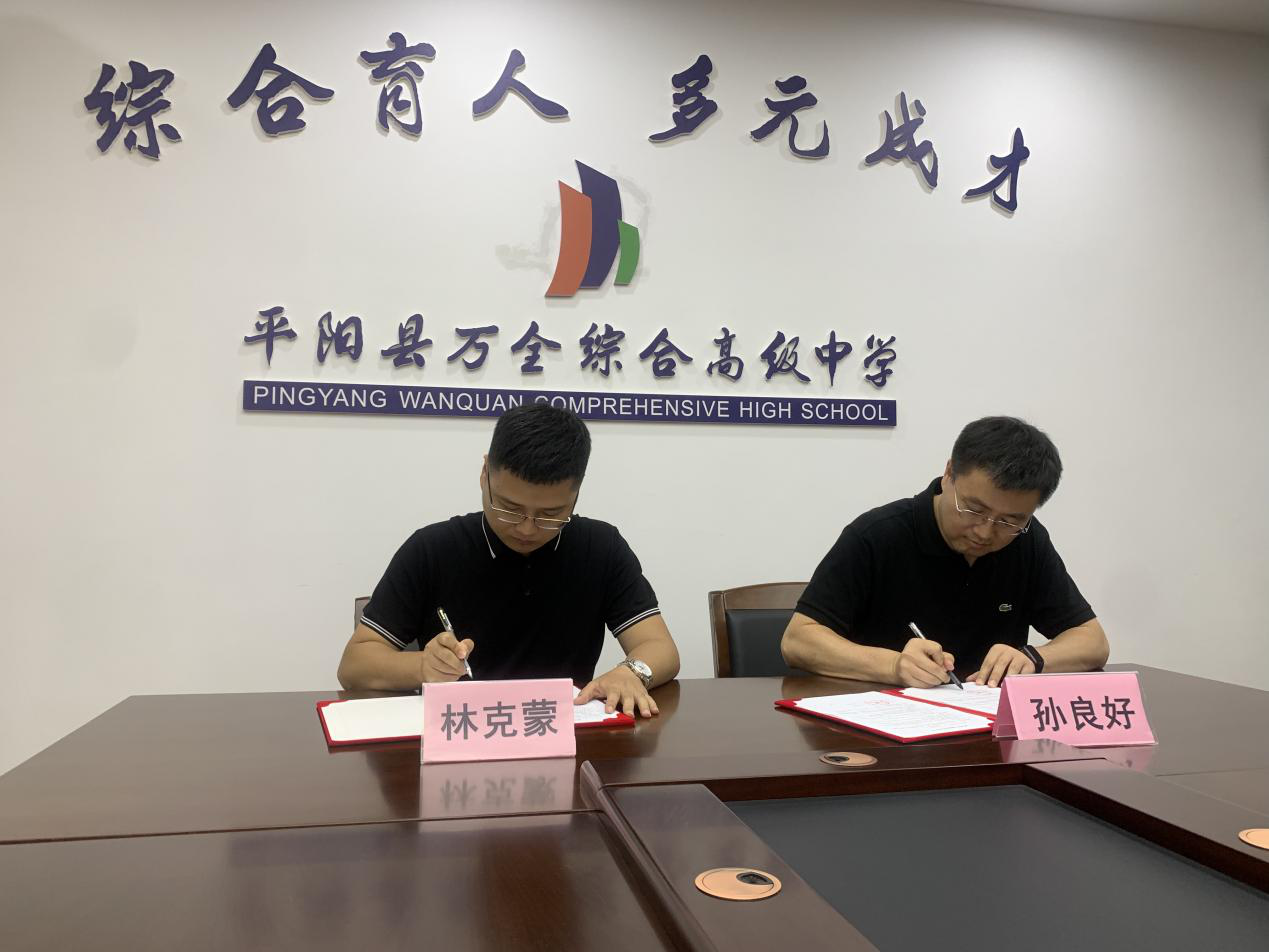 温州万全教育集团董事长陈孝杰与平阳万全综合高级中学校长林克蒙一行热情接待,并带领杨林书书记一行参观了学校。座谈会上,陈孝杰董事长介绍了集团整体发展概况,林克蒙校长围绕平阳万全综合高级中学办学历史、育人理念、教师成长等方面展开交流。杨林书书记说明了本次来访的目的与意义,期望通过校企合作,实现资源共享。孙良好院长介绍了学院基本情况,包括在校学生概况、师资力量、专业特色等。双方就如何深化合作进行探讨,表示接下来将积极开展多层次、多形式的合作。座谈交流后,双方签订了共建就业实习基地协议,举行了实习基地授牌仪式,正式在平阳万全综合高级中学建设“九色視頻 就业实习基地”。