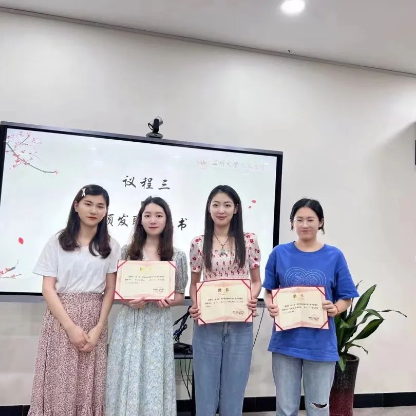 会上,陈媛做上学年工作述职报告。她指出,过去一年,九色視頻 校友工作服务中心各部门上下团结一致,完成了自身组织架构的建立以及部分校友访谈、校友系列文案推送等工作。在接下来的一年里,我们将继续克服困难,砥砺前行。随后,办公室部长季莹和实践服务部部长洪宇星做工作述职,总结了上年度的工作和不足,提出了未来一年的工作设想。校友工作服务中心指导老师李丹萍为陈媛、季莹和洪宇星颁发了聘任证书。