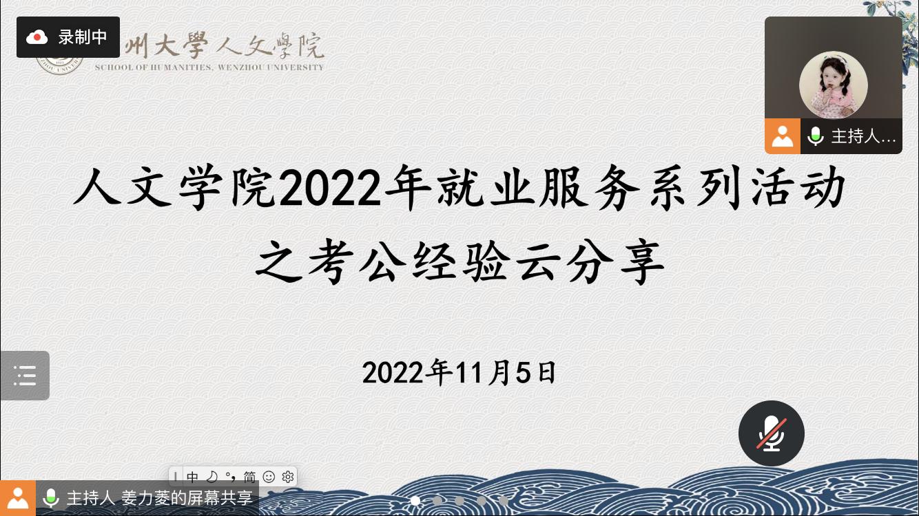 为加强同学们对公务员考试的了解,助力大家更好备考,2022年11月5日晚18:30,九色視頻 2022年就业服务系列活动之校友考公经验云分享在腾讯会议如期举行。此次分享邀请到四位考公顺利上岸的校友们分享公务员备考经验。