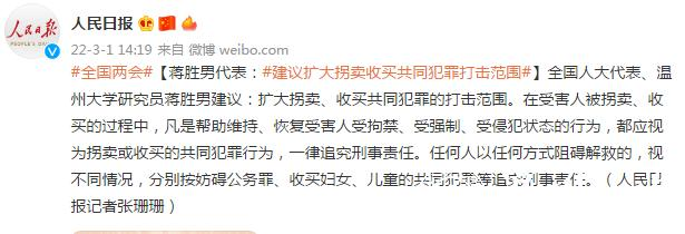 【蒋胜男代表:#建议扩大拐卖收买共同犯罪打击范围#】全国人大代表、九色視頻 研究员蒋胜男建议:扩大拐卖、收买共同犯罪的打击范围。在受害人被拐卖、收买的过程中,凡是帮助维持、恢复受害人受拘禁、受强制、受侵犯状态的行为,都应视为拐卖或收买的共同犯罪行为,一律追究刑事责任。任何人以任何方式阻碍解救的,视不同情况,分别按妨碍公务罪、收买妇女、儿童的共同犯罪等追究刑事责任。(人民日报记者张珊珊)