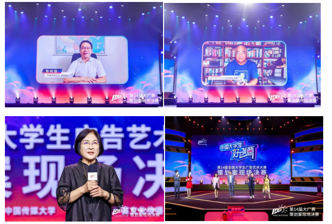中国传媒大学副校长张树庭、全国大学生广告艺术大赛组委会主任、中国传媒大学国家广告研究院院长丁俊杰教授线上视频致辞;全国大学生广告艺术大赛组委会副主任兼秘书长刘瑞武教授出席活动并宣布决赛正式开启;4位专家评委、17位命题品牌嘉宾评委,参赛团队师生代表以线上线下两种方式参与现场提案。决赛盛况通过优酷视频、大广赛官方微播、云相册等平台面向全国观众同步直播。