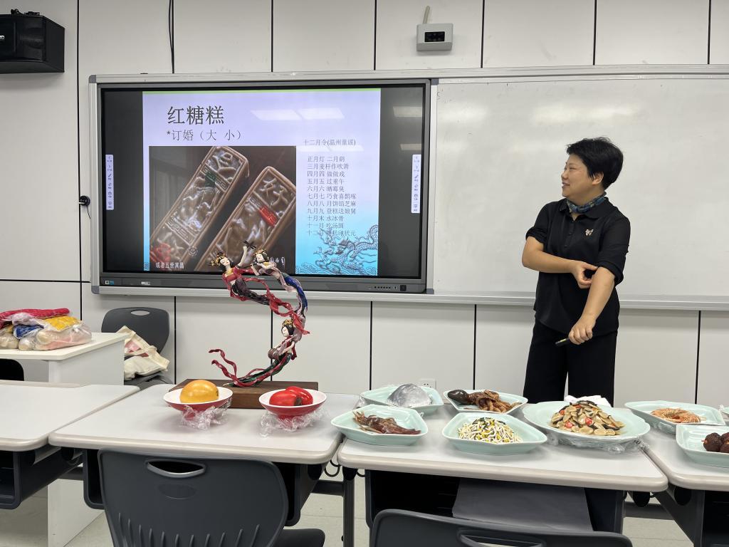 “九月九,登糕送娘舅。九月九吃要登糕,这是我们乐清人的民俗乐事。”在“手造温州”课堂上,乐清米塑工艺传承人郑小红老师十分风趣幽默地讲述了“红糖糕”和“白年糕”的民俗趣事和在四时八节、结婚礼俗中的造型特点。美味触动味蕾,郑老师还与同学们分享了她带来的自家手工红糖糕。