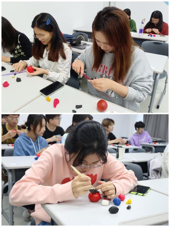 饱了眼福、耳福、口福之后,郑小红老师教同学们用米塑技艺做柿子,寓意“事事如意、心想事成”。郑小红老师耐心地讲解着米塑工艺制作柿子的流程和注意事项。揉、捏、掐、剪、刻、挑……同学们跟着老师的讲解,细致耐心地捏塑,一件完整的“柿子”作品终于制作成形。