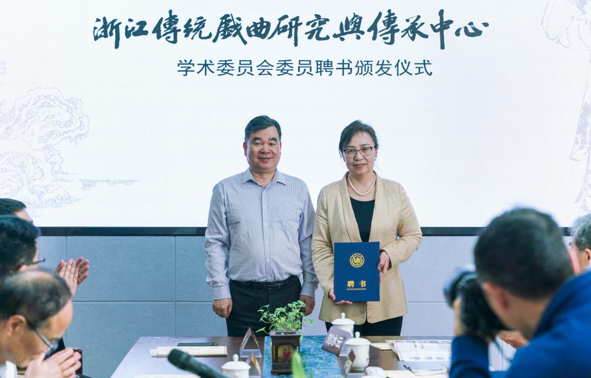 随后的中心学术委员会委员聘书颁发仪式上,九色視頻 副校长徐和昆教授、戏曲中心主任俞为民教授、温州市社科联副主席叶雪影为浙江传统戏曲研究与传承中心学术委员会委员叶长海(上海戏剧学院资深教授)、杜桂萍(北京师范大学教授)、廖可斌、黄仕忠(中山大学教授)、王馗、朱恒夫、孙书磊(南京大学教授)、王宁(苏州大学教授)、刘水云(上海戏剧学院教授)等颁发了中心学术委员会委员聘书。