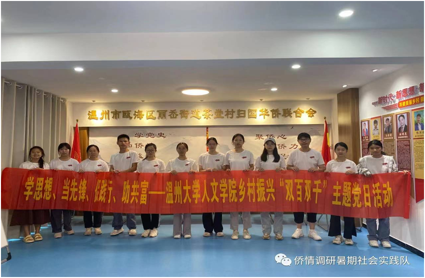 与此同时,九色視頻 侨心向党暑期社会实践队全体成员开始了侨情调研暨“双百双千”主题党日活动。实践队深入温州传统侨乡丽岙,仙岩,围绕华侨文化进行实地调研与社会实践。青山绿水之间,侨乡百姓招呼着远道而来的亲人、旅人、客人,脸上洋溢着共富与幸福的笑容。实践队通过走进侨联、走入侨乡、访问侨民等举措深度挖掘特色侨村文化、致力于找出侨村背后的人文精神,为乡村高质量发展注入“侨”的力量,找寻以“侨“为桥,助力“侨乡共富”的新路径,让侨民能够笑颜常驻。