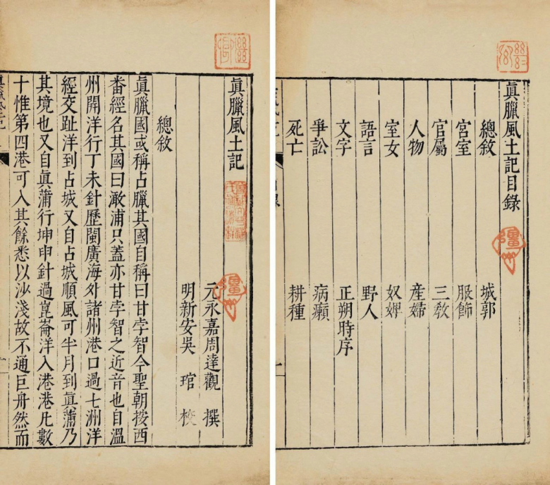 《真腊风土记》的总叙里还提到“自温州开洋,行丁未针。历闽、广海外诸州港口,过七洲洋,经交趾洋到占城。又自占城顺风可半月到真蒲,乃其境也”。大意为从温州港出海,使用罗盘往西南行,经历福建、广东等地一些港口,又过了海南岛,经越南北部海域后到达占城。从占城顺风行船半个月到了真蒲,这才到吴哥的国境。