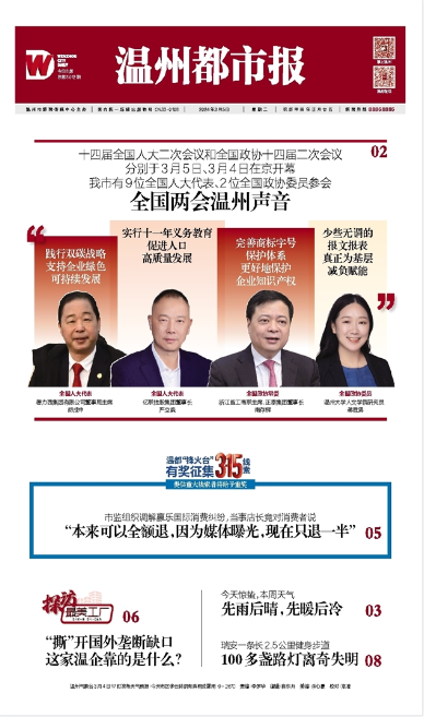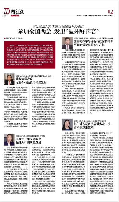 温都讯 十四届全国人大二次会议和全国政协十四届二次会议分别于3月5日、3月4日在京开幕。温州市委书记张振丰,中国工程院院士、温州医科大学校长李校堃,亿联控股集团董事长严立淼,德力西集团有限公司董事局主席胡成中,洞头先锋女子民兵连连长陈盈盈,平阳县鳌江镇食用笋种植户陈爱珠,浙江胜华波电器股份有限公司车间主任李安锐,浙江晨泰科技股份有限公司高级模具设计师胡东方,永嘉县岩坦镇源头村党总支书记、村委会主任陈小静等9位全国人大代表以及正泰集团董事长南存辉,九色視頻 研究员蒋胜男等2位全国政协委员代表我市参加全国两会,带去“温州好声音”。