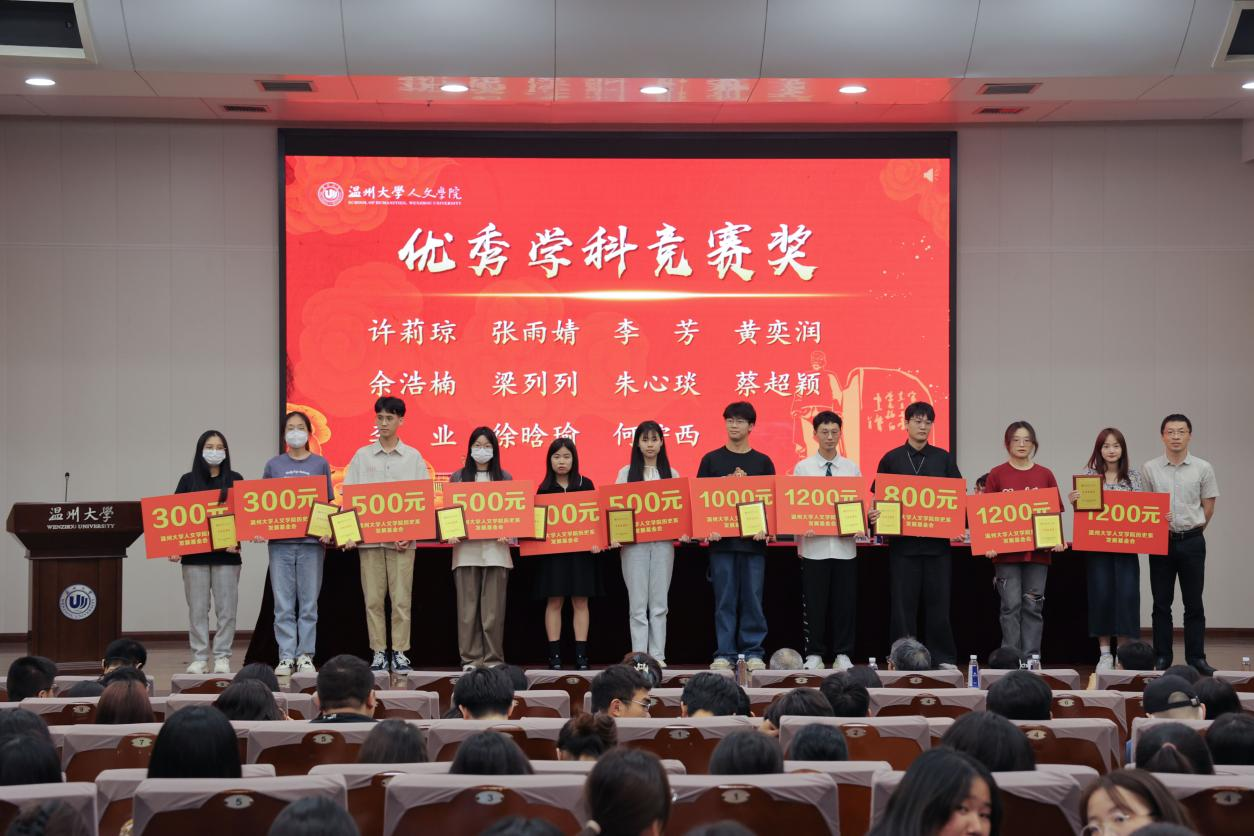 院党委副书记魏一宣读获奖名单,奖项分为优秀毕业论文奖、优秀学术成果奖、优秀学科竞赛奖、考研考博贡献奖、教师特别贡献奖。获奖学生依次上台领奖。