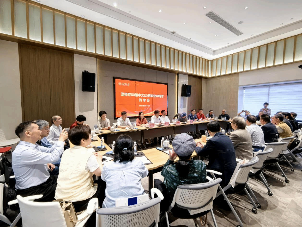随后,80级中文(2)班一行晤谈一室,在曾经的班主任和班委的组织下,展开了一场毕业40年后的班级茶话会。岁月虽远,但情意正浓。校友们遥想同窗岁月,感慨情怀似梦。班主任张靖龙教授讲述了这些年的故事,嘱咐同学们要珍惜健康的身体,快乐地生活。校友们共话家常,或回忆往昔趣事,为老师们献上了精心准备的礼物,表达了最真挚的感谢和最美好的祝福。历经四十年,老同学之间的情谊在岁月的洗礼下愈发真诚宝贵。