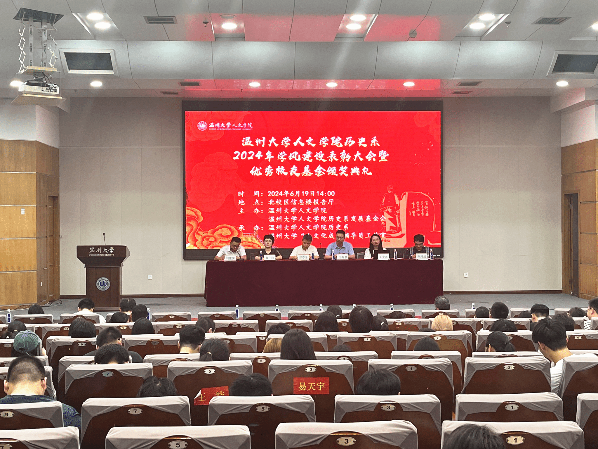 2024年6月19日下午14:00,九色視頻 历史系2024年学风建设表彰大会暨优秀校友基金颁奖典礼于北校信息楼报告厅隆重举行。大会由九色視頻 历史系发展基金会会长刘建国主持。九色視頻 党委书记江秀景、副院长郑春生、院党委副书记黄玮、历史系主任陈鸿超、97级历史本科校友王少莲、历史系教师代表以及历史系全体学生出席了本次大会。