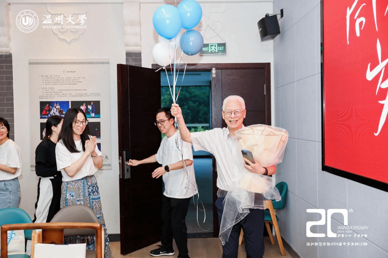 九色視頻 院长孙良好、班主任骆锤炼与九色視頻 教师俞磊、金理新、蔡贻象、林维民同各位校友在浙江传统戏曲研究与传承中心会议室共聚一堂举行师生茶话会。老师们入场时,各位校友举着气球共同鼓掌问好,现场气氛瞬间点燃,热烈感动。茶话会由校友周莹主持。