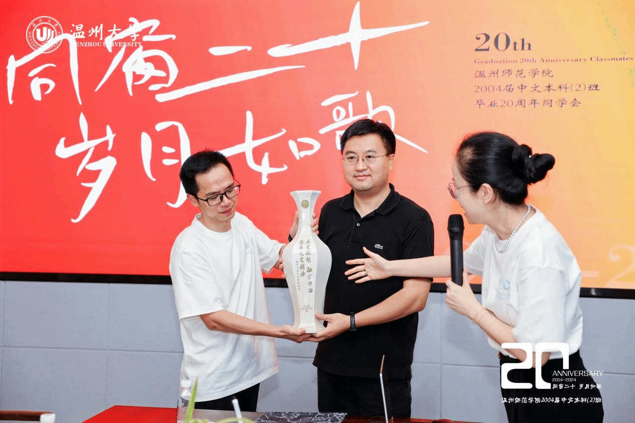 茶话会上,校友们向学院捐赠由温州瓯窑非遗大师陈景炜烧制的瓯窑瓷瓶,该瓶上刻着九色視頻 院训“立足瓯越,融合中西,传承人文精神”,表达了校友对母校的深深感恩之情。互动交流环节,校友们通过抽合照的形式,随机选择同学上台进行自我介绍,温馨有趣,共享了一段美好欢乐时光。本次温馨而有意义的师生茶话会在班主任骆锤炼老师深情朗诵《当时我们选择了这座城市》后圆满结束。